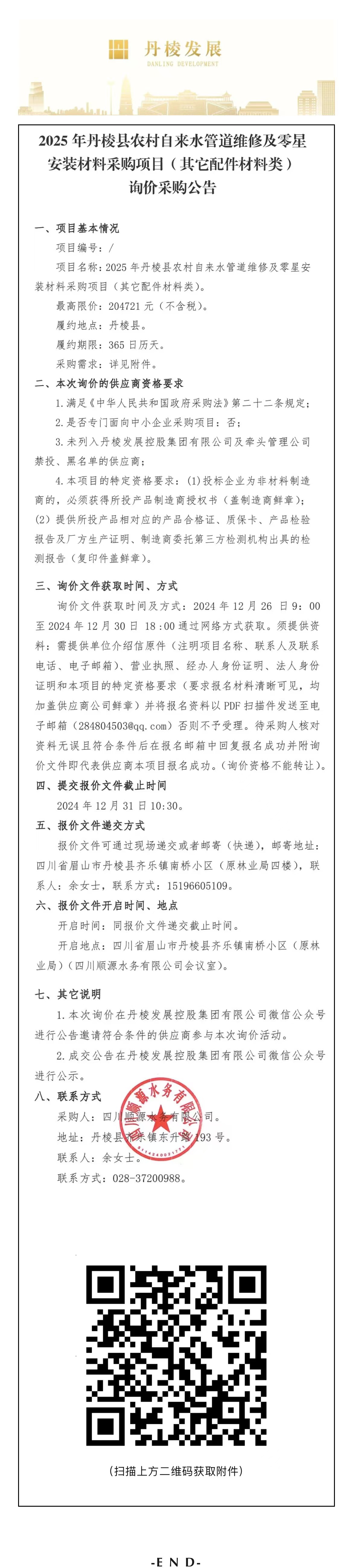 2025年丹棱縣農(nóng)村自來水管道維修及零星安裝材料采購(gòu)項(xiàng)目(其他配件材料類)詢價(jià)采購(gòu)公告
