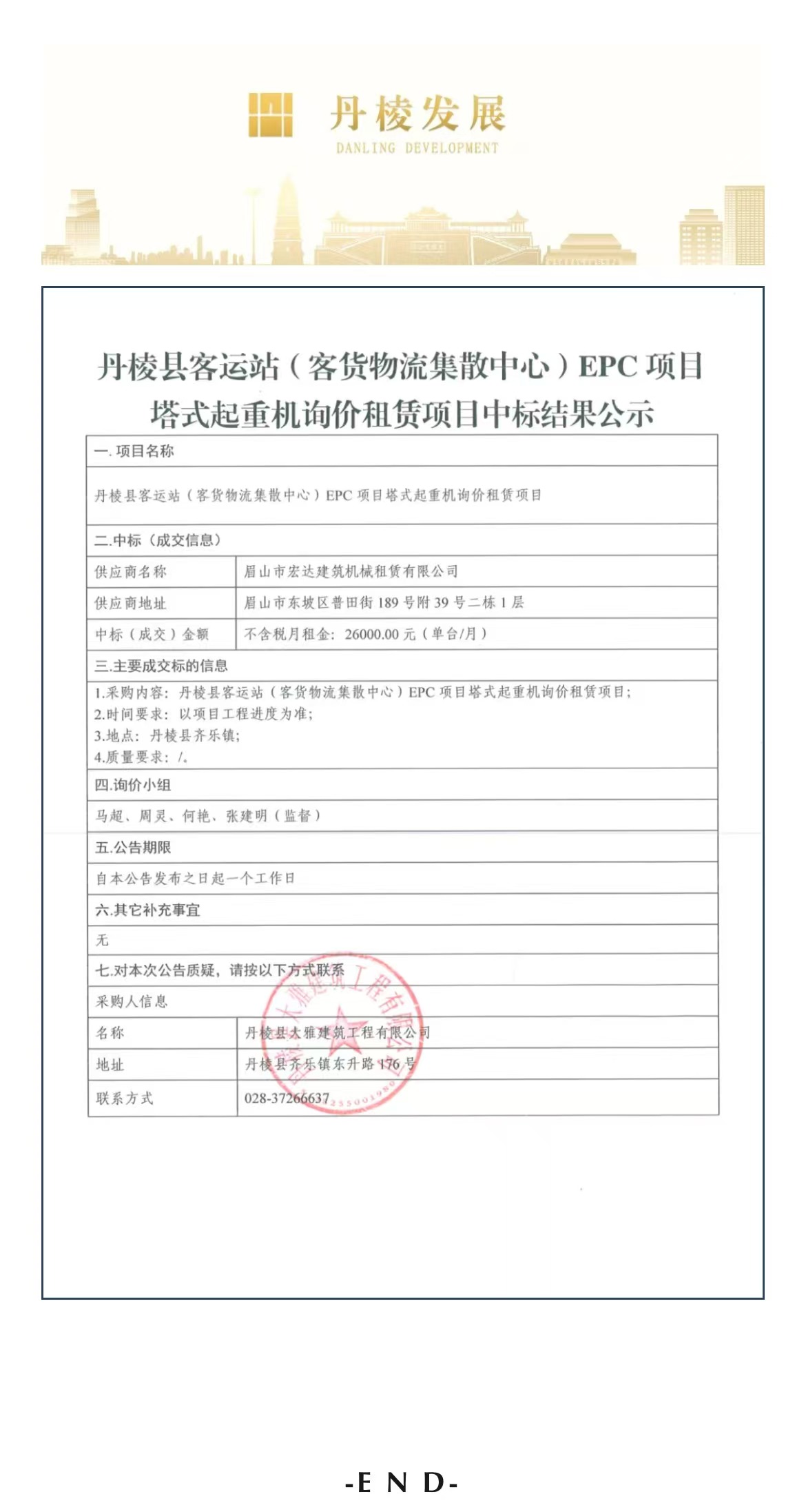 丹棱縣客運(yùn)站(客貨物流集散中心)EPC項(xiàng)目塔式起重機(jī)詢價(jià)租賃項(xiàng)目中標(biāo)結(jié)果公示