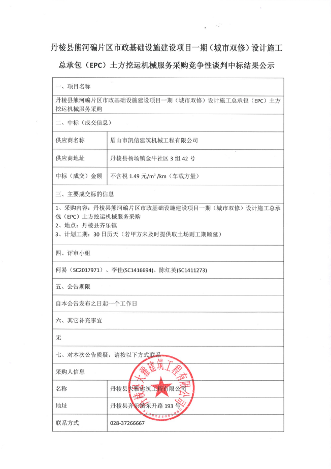 丹棱縣熊河碥片區(qū)市政基礎(chǔ)設(shè)施建設(shè)項目一期(城市雙修)設(shè)計施工 總承包(EPC)土方挖運機械服務(wù)采購競爭性談判中標(biāo)結(jié)果公示