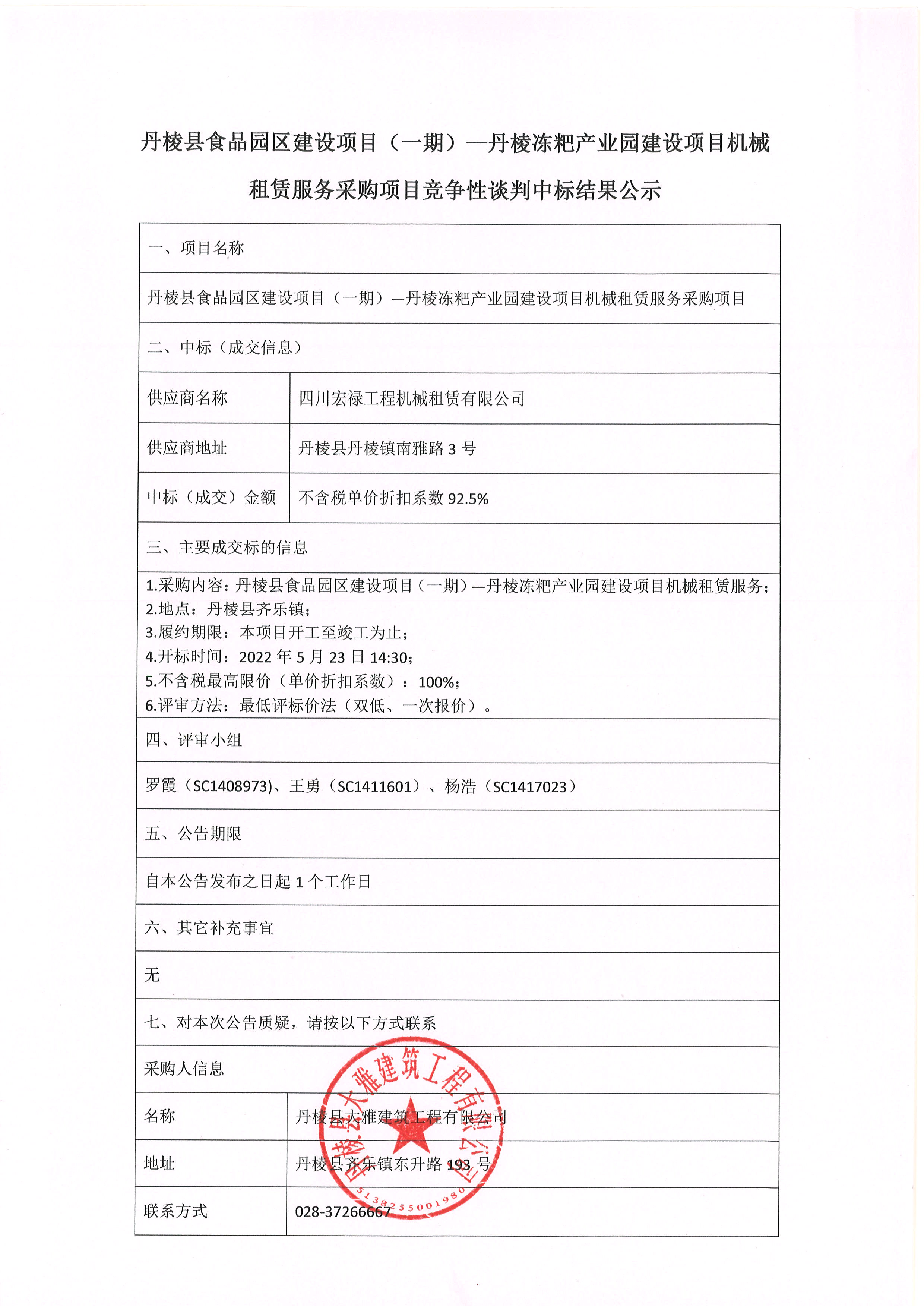 丹棱縣食品園區(qū)建設(shè)項(xiàng)目(一期)-丹棱凍粑產(chǎn)業(yè)園建設(shè)項(xiàng)目機(jī)械 租賃服務(wù)采購項(xiàng)目競(jìng)爭(zhēng)性談判中標(biāo)結(jié)果公示