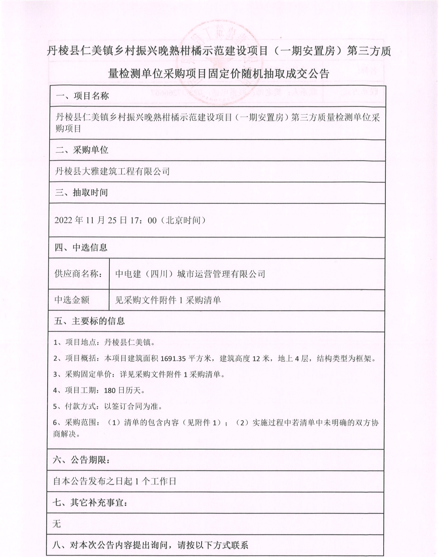 丹棱縣仁美鎮(zhèn)鄉(xiāng)村振興晚熟柑橘示范建設(shè)項(xiàng)目(一期安置房) 第三方質(zhì)量檢測單位采購項(xiàng)目固定價(jià)隨機(jī)抽取成交公告