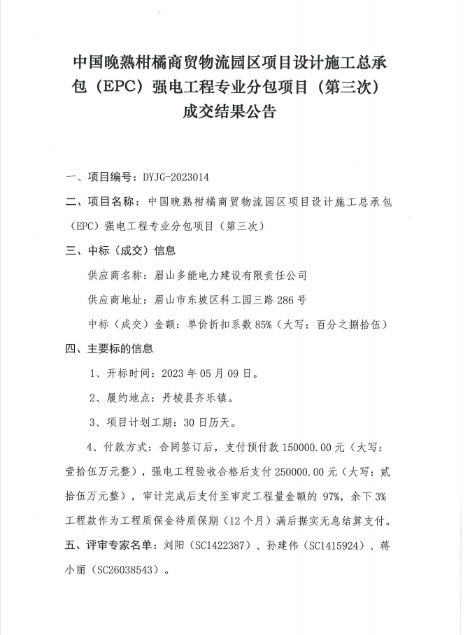 中國(guó)晚熟柑橘商貿(mào)物流園區(qū)項(xiàng)目設(shè)計(jì)施工總承包(EPC)強(qiáng)電工程專(zhuān)業(yè)分包項(xiàng)目(第三次)成交結(jié)果公告