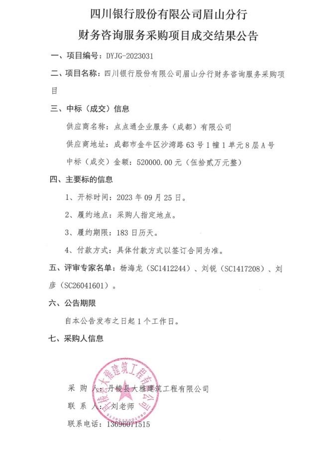 四川銀行股份有限公司眉山分行財務咨詢服務采購項目成交結果公告