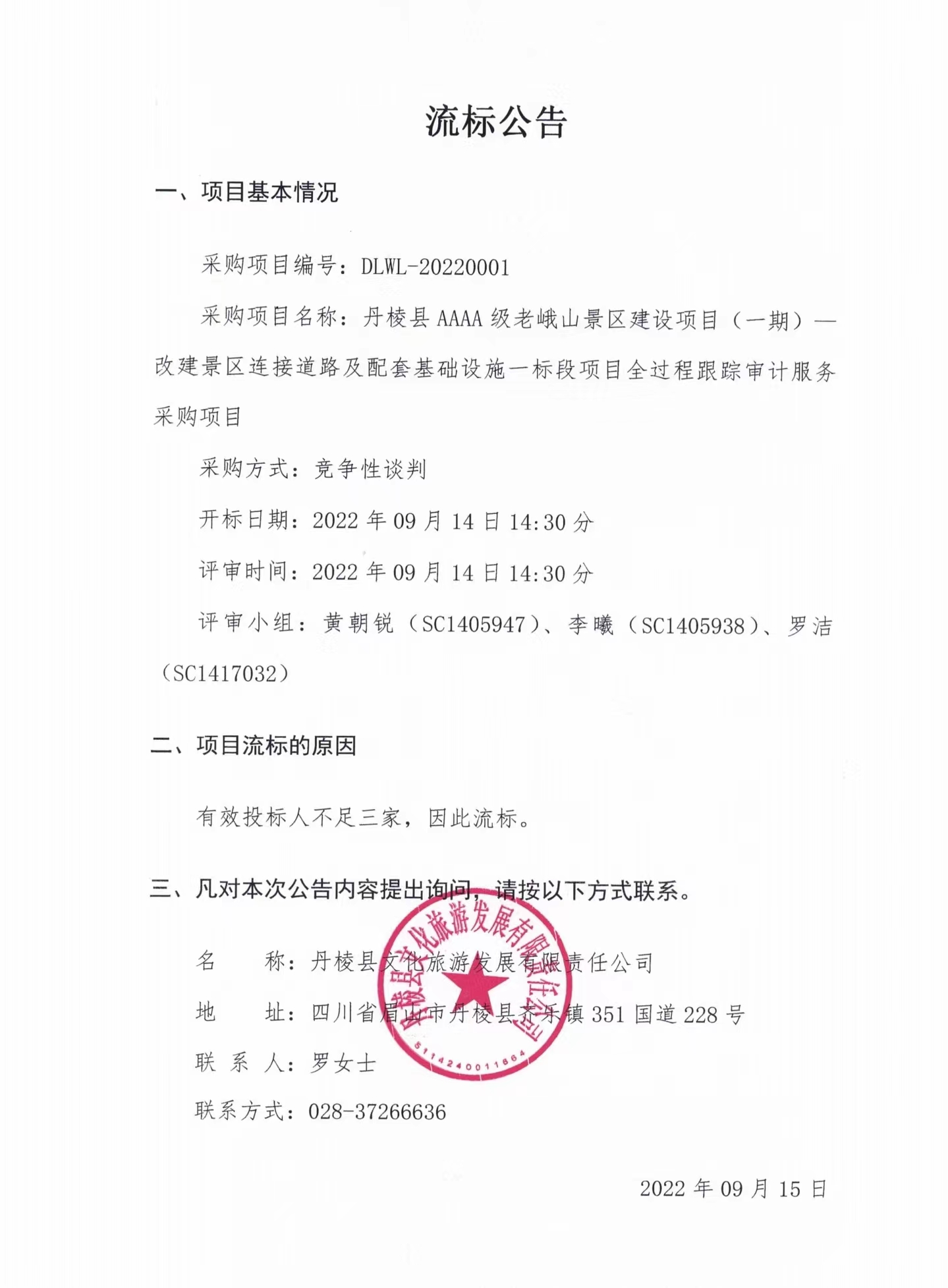 丹棱縣AAAA級老峨山景區(qū)建設項目(一期)--改建景區(qū)連接道路及配套基礎設施一標段項目全過程跟蹤審計服務采購項目流標公告