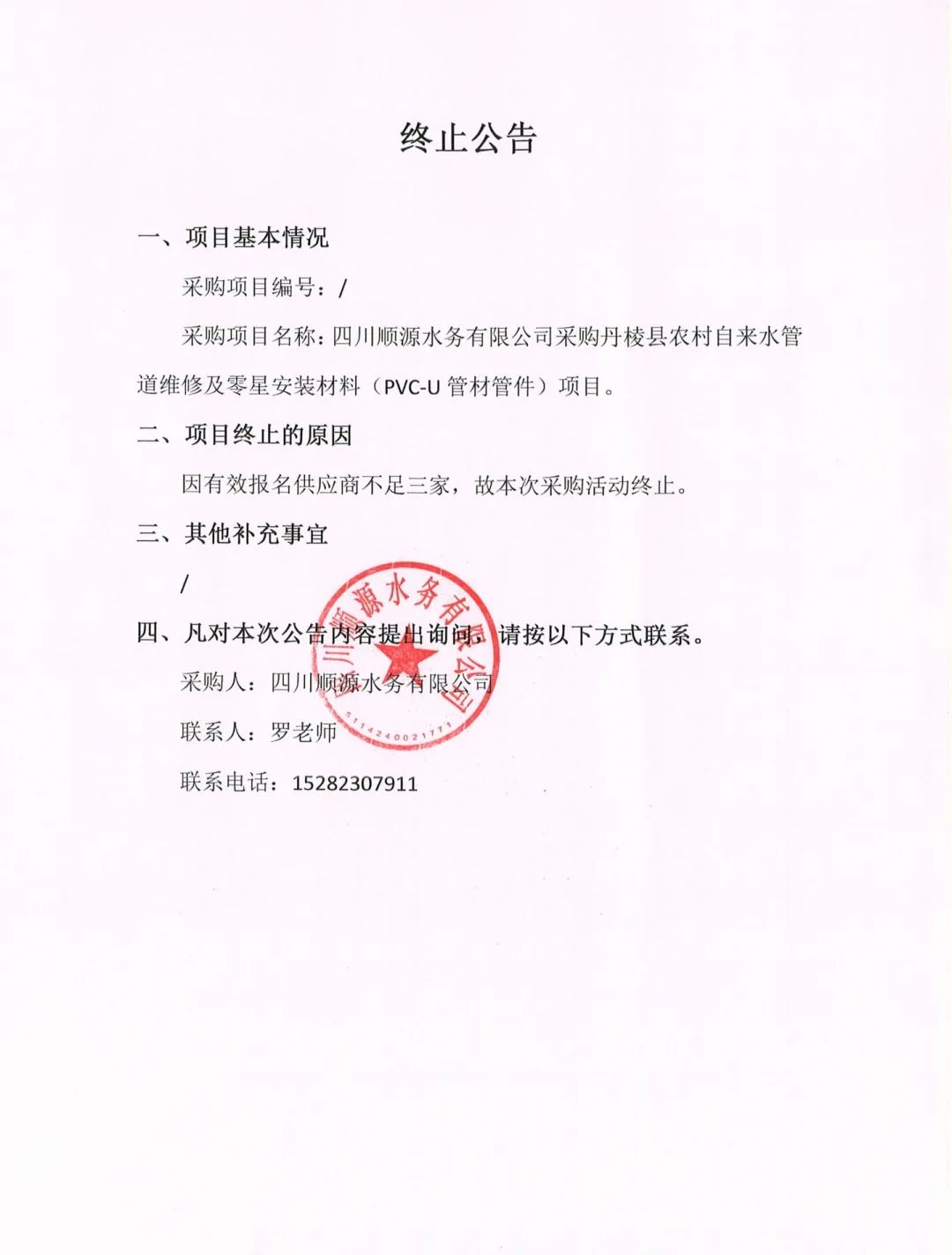 四川順源水務有限公司采購丹棱縣農(nóng)村自來水管道維修及零星安裝材料(PVC-U管材管件)項目終止公告