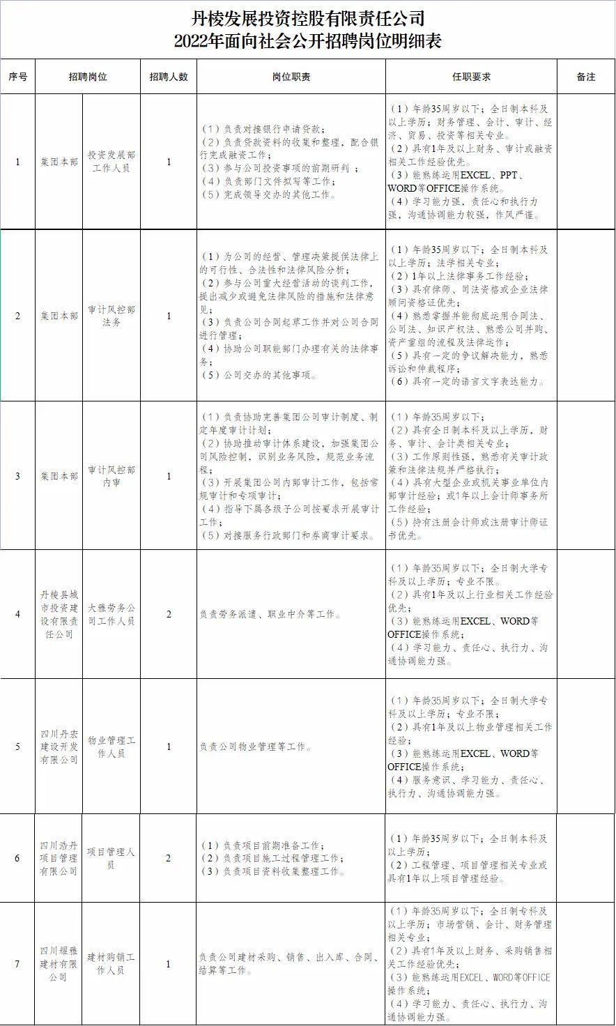 招聘崗位的學(xué)歷、專業(yè)、資歷、年齡等資格條件詳見附件《丹棱發(fā)展投資控股有限責(zé)任公司2022年面向社會(huì)公開招聘崗位明細(xì)表》。