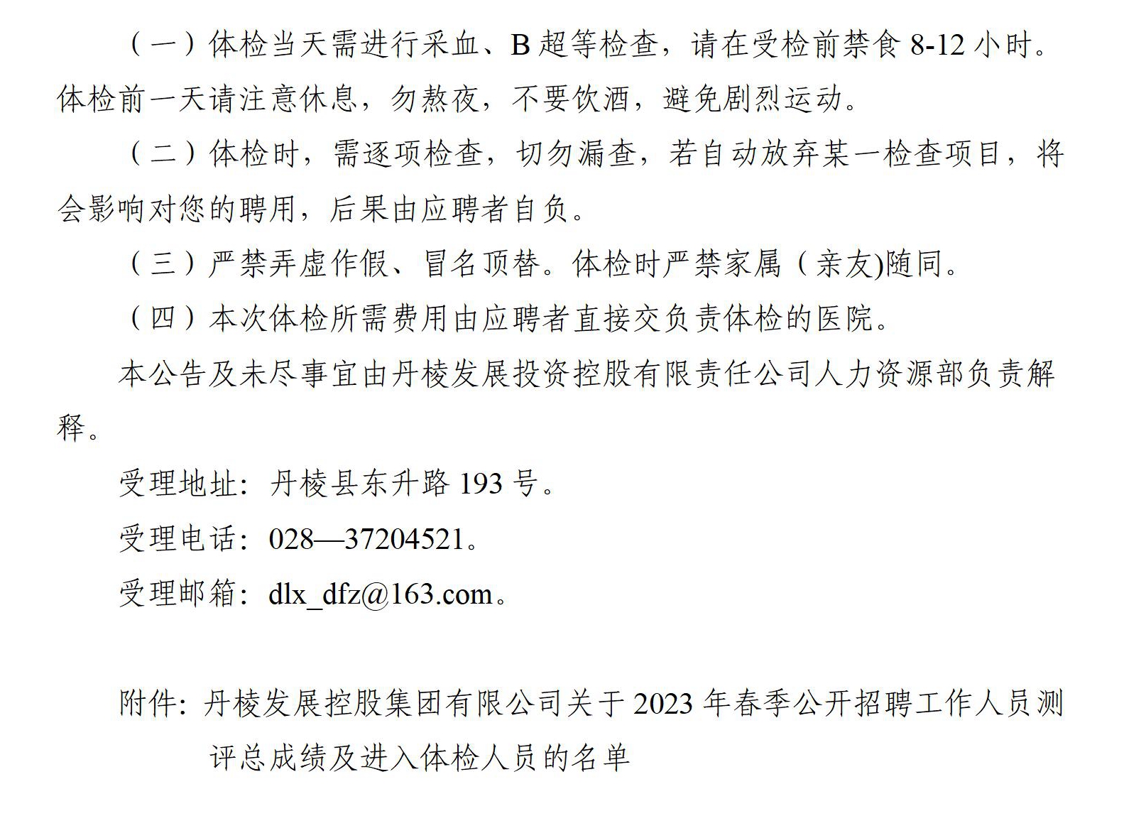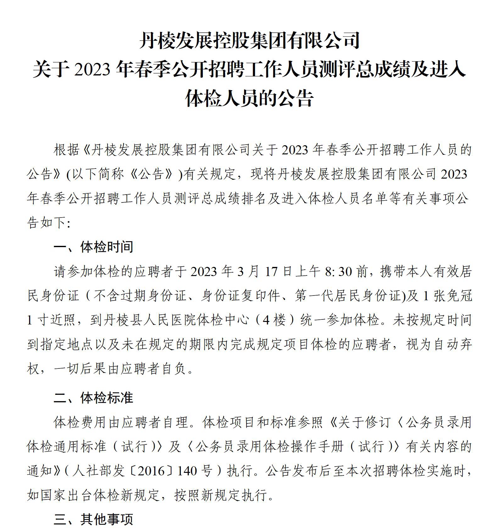 丹棱發(fā)展控股集團(tuán)有限公司關(guān)于2023年春季公開招聘工作人員測評(píng)總成績及進(jìn)入體檢人員的公告