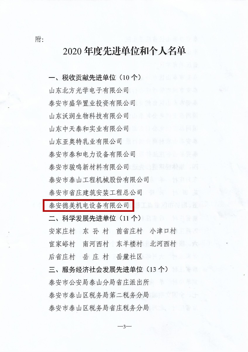近日,中共泰山區(qū)省莊鎮(zhèn)委員會、泰山區(qū)省莊鎮(zhèn)人民政府為突出貢獻的2020年度先進單位予以表彰。共10家企業(yè)獲評“稅收貢獻先進單位”,泰安德美機電榜上有名。