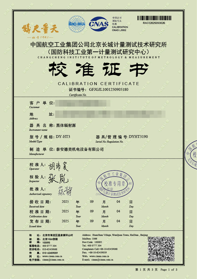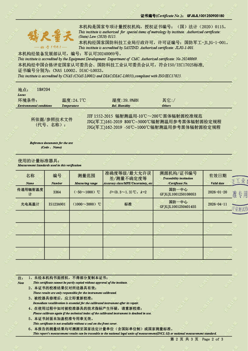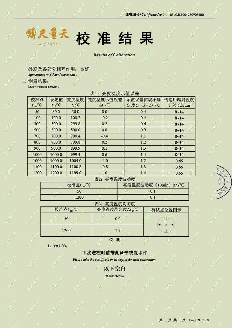 黑體輻射源(50-1200℃)校準證書 2025-9-22 本文被閱讀 1054 次