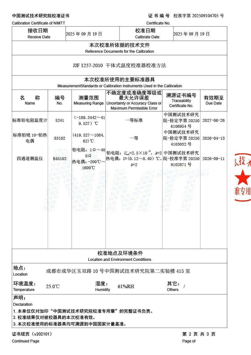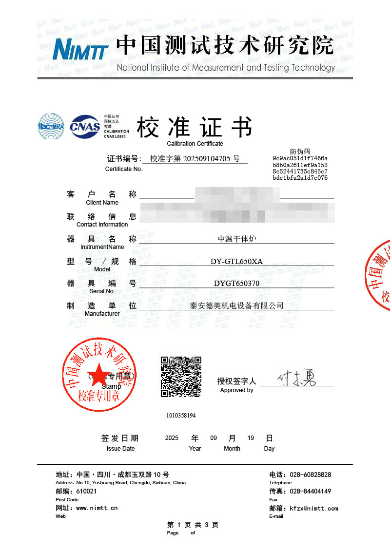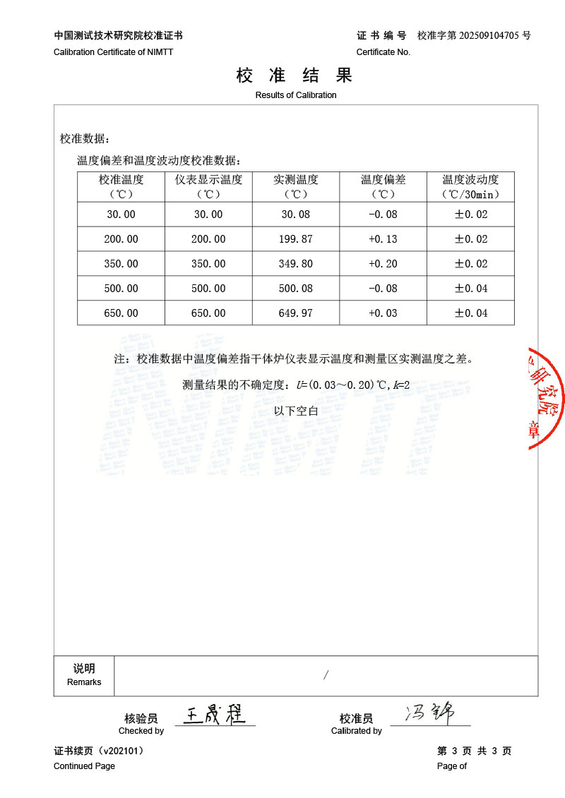 中溫干體爐(30-650℃)校準(zhǔn)證書 2025-9-22 本文被閱讀 1233 次